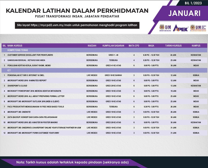 Sebanyak 90 latihan Teras, Fungsian & ICT telah ditawarkan kepada Warga Universiti bagi fasa 1.